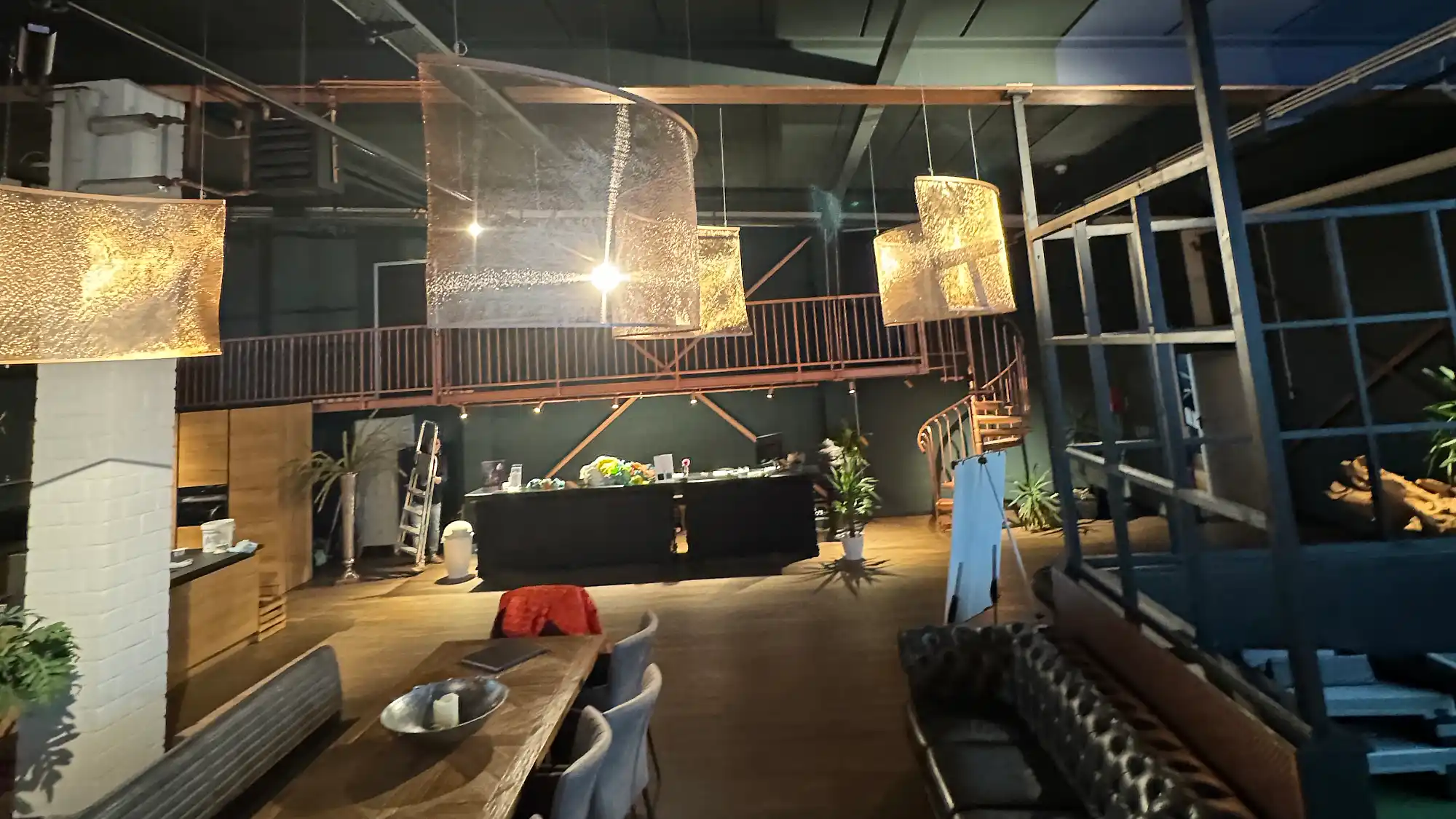 Die Allgemeinbeleuchtung der Hohen Halle erzeugen die DOMUS Pendelleuchten mit breit gestreutem, diffusen Licht. Unterschiedliche Pendelleuchten über dem Zirkel und im Loungebereich lockern die Atmosphäre im Studio auf.